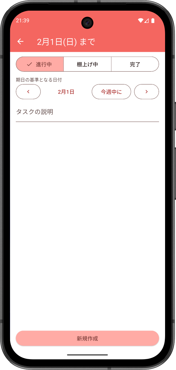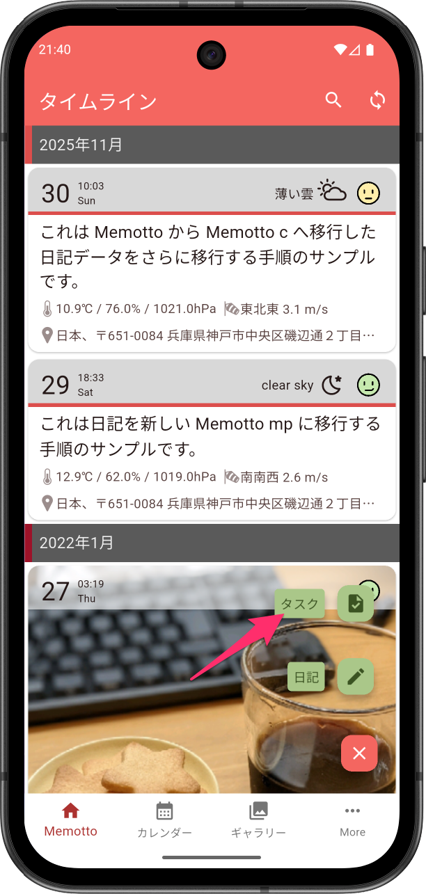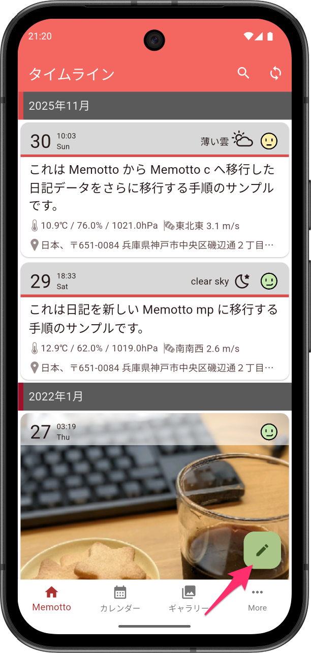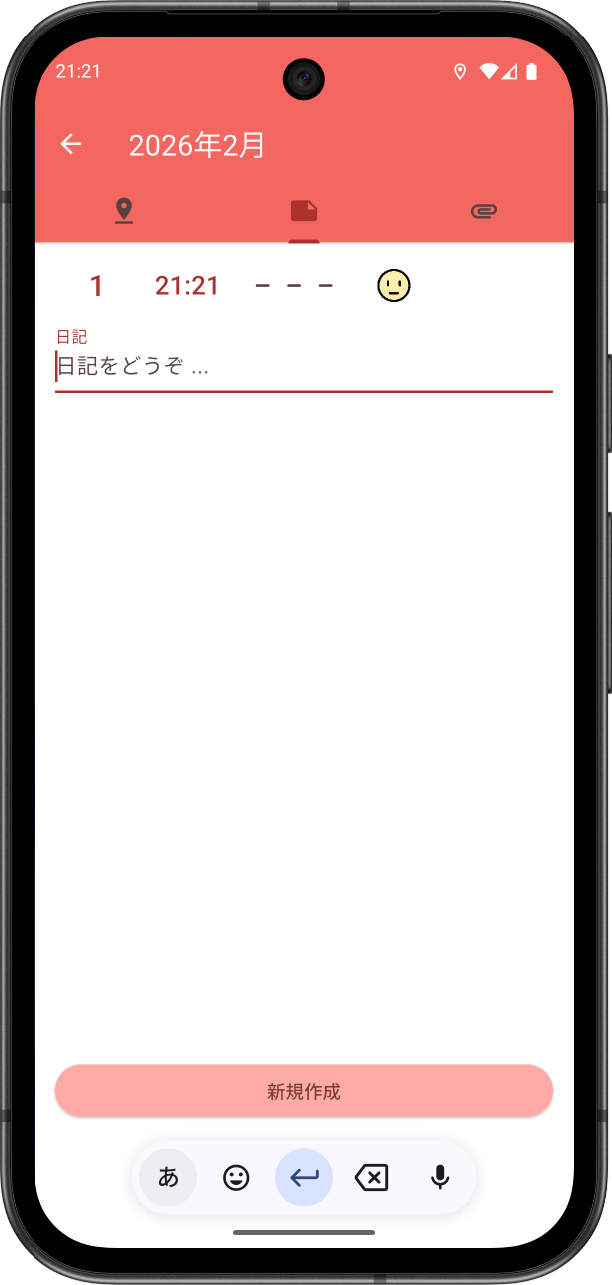 タイムラインの新規ボタンのデフォルトの動作は、タップすると新規日記の編集画面が開きます。