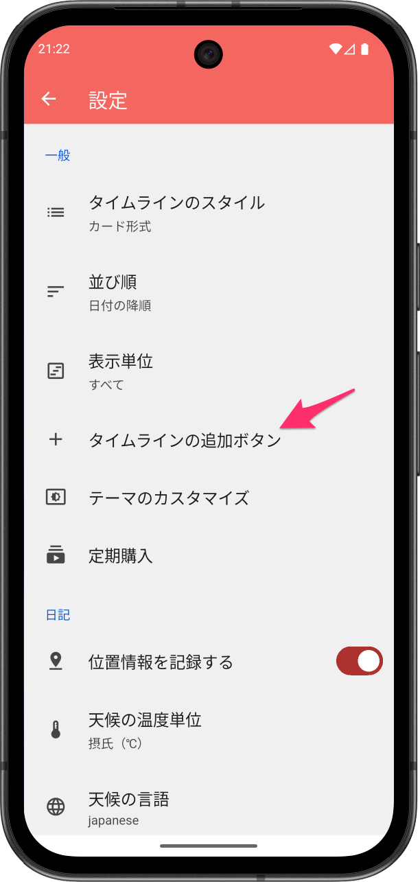 画面下部のメニューをタップして設定画面に移動し、[タイムラインの追加ボタン] をタップしてカスタマイズする画面を開きます。