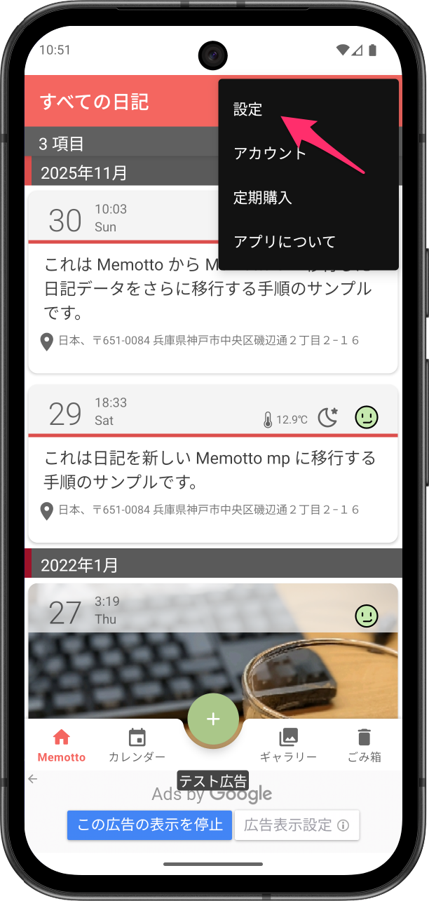 設定画面の「日記のエクスポート」ではありませんのでご注意ください。