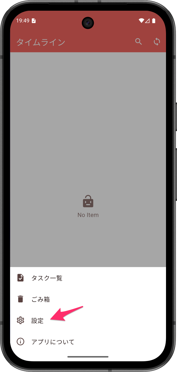 次に、Memotto mp アプリを起動し、画面下部のメニューをタップして設定画面に移動します。