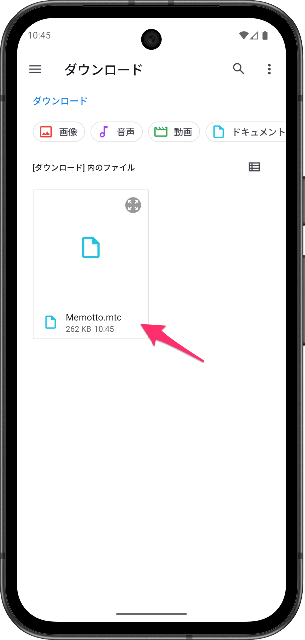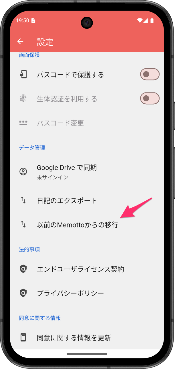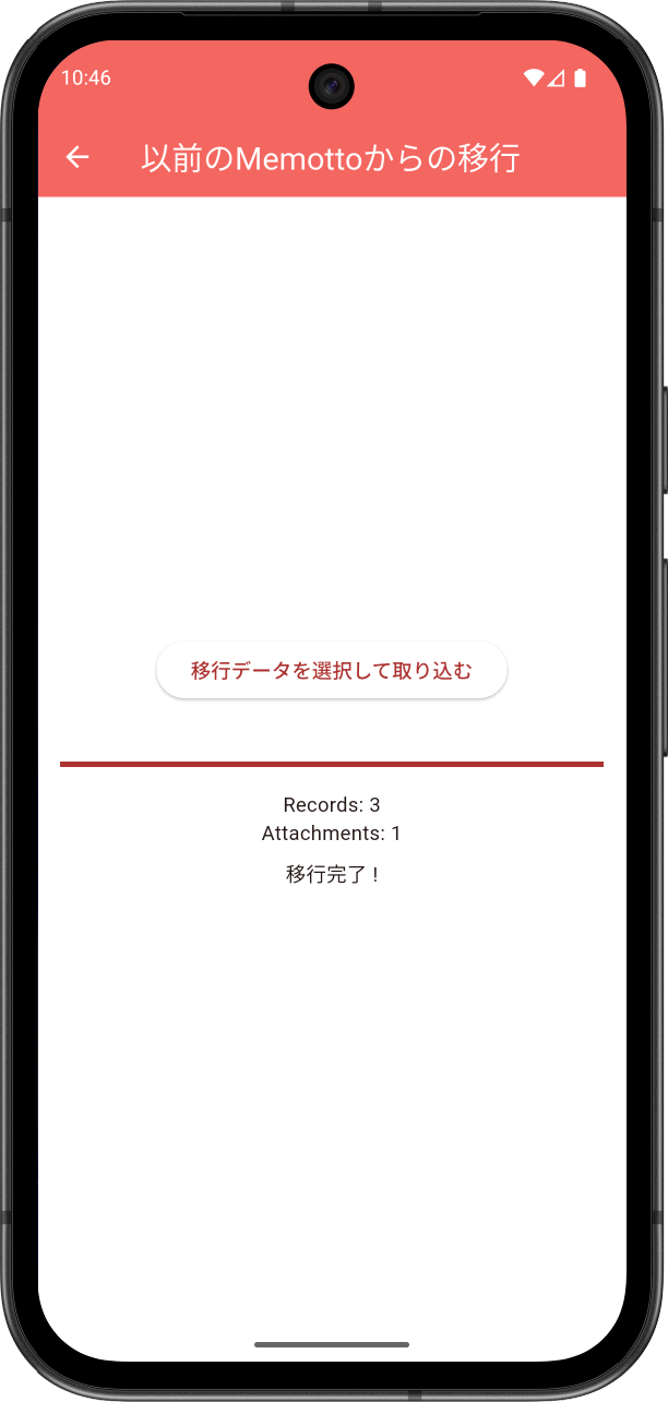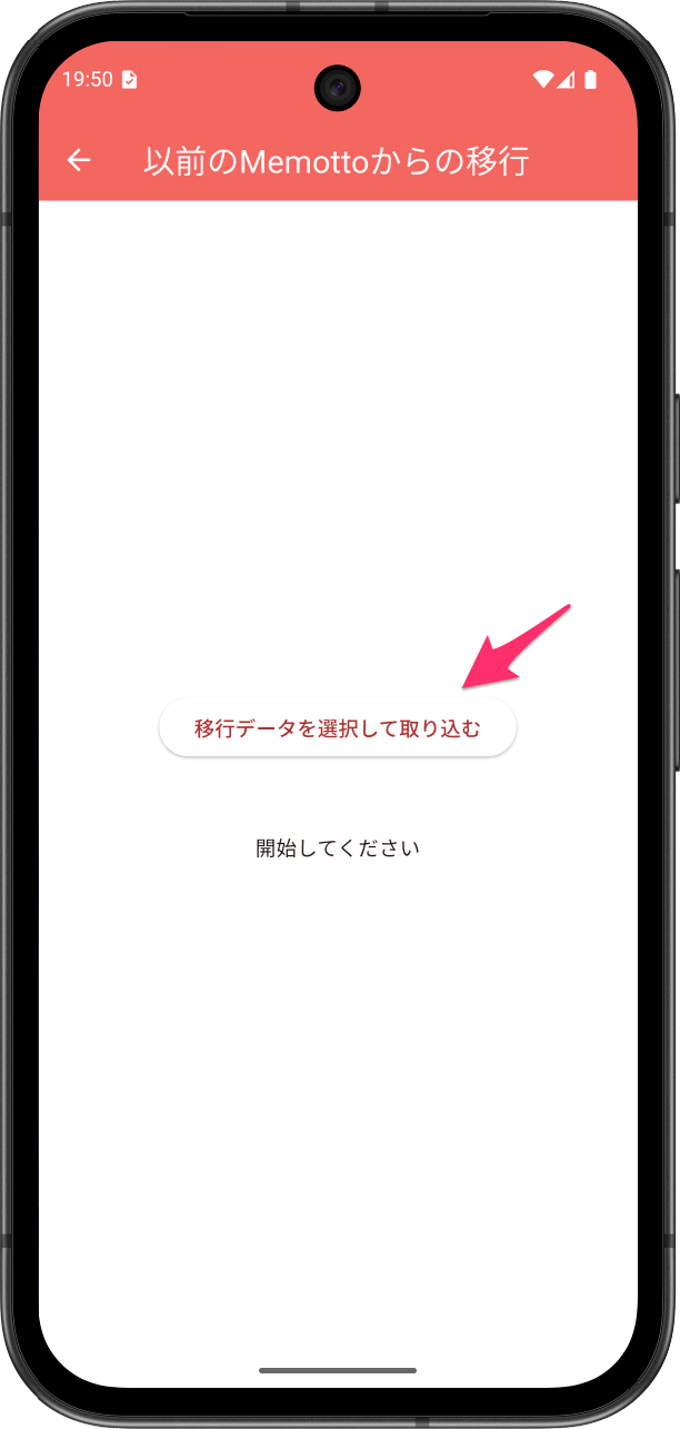Memotto mp の「以前の Memotto からの移行」画面にある「移行データを選択して取り込む」をタップし、ステップ1で保存したエクスポートファイルを選択します。