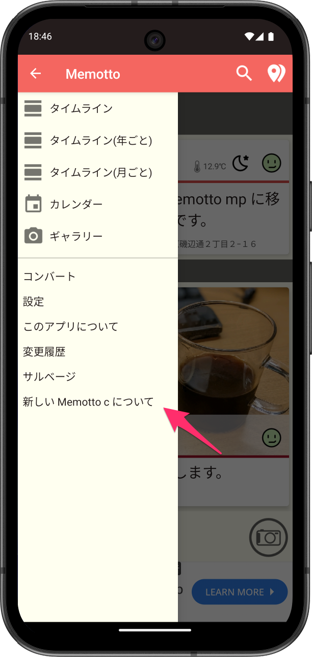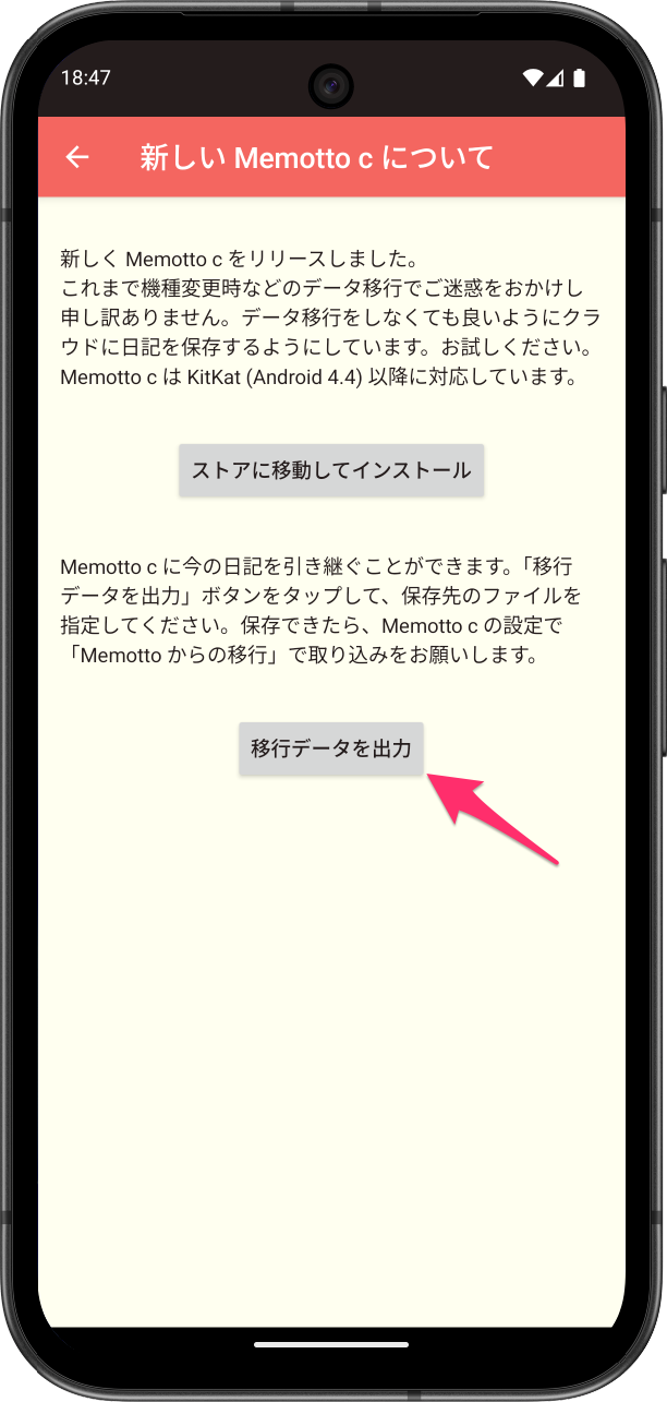 まず Memotto アプリを起動し、メニューの「新しい Memotto c について」から移行データの出力を行います。