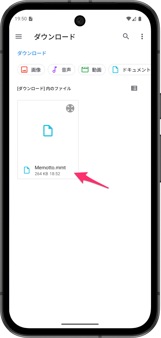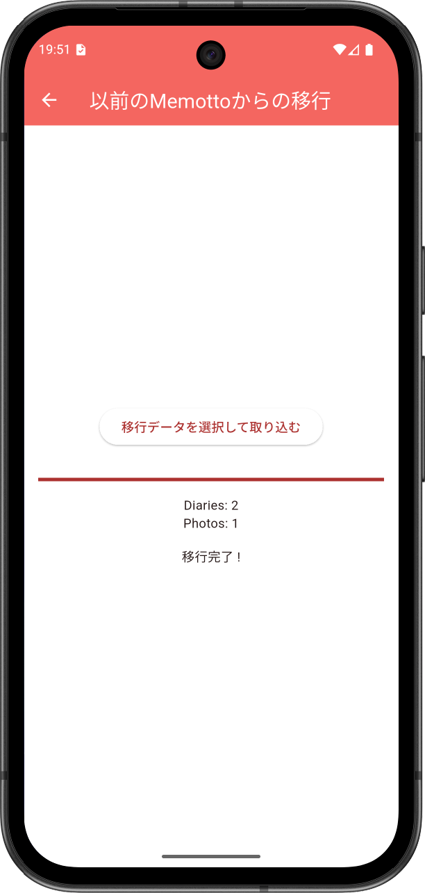 Memotto mp の「以前の Memotto からの移行」画面にある「移行データを選択して取り込む」をタップし、ステップ1で保存したエクスポートファイルを選択します。
